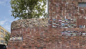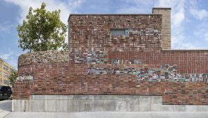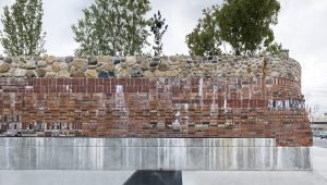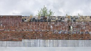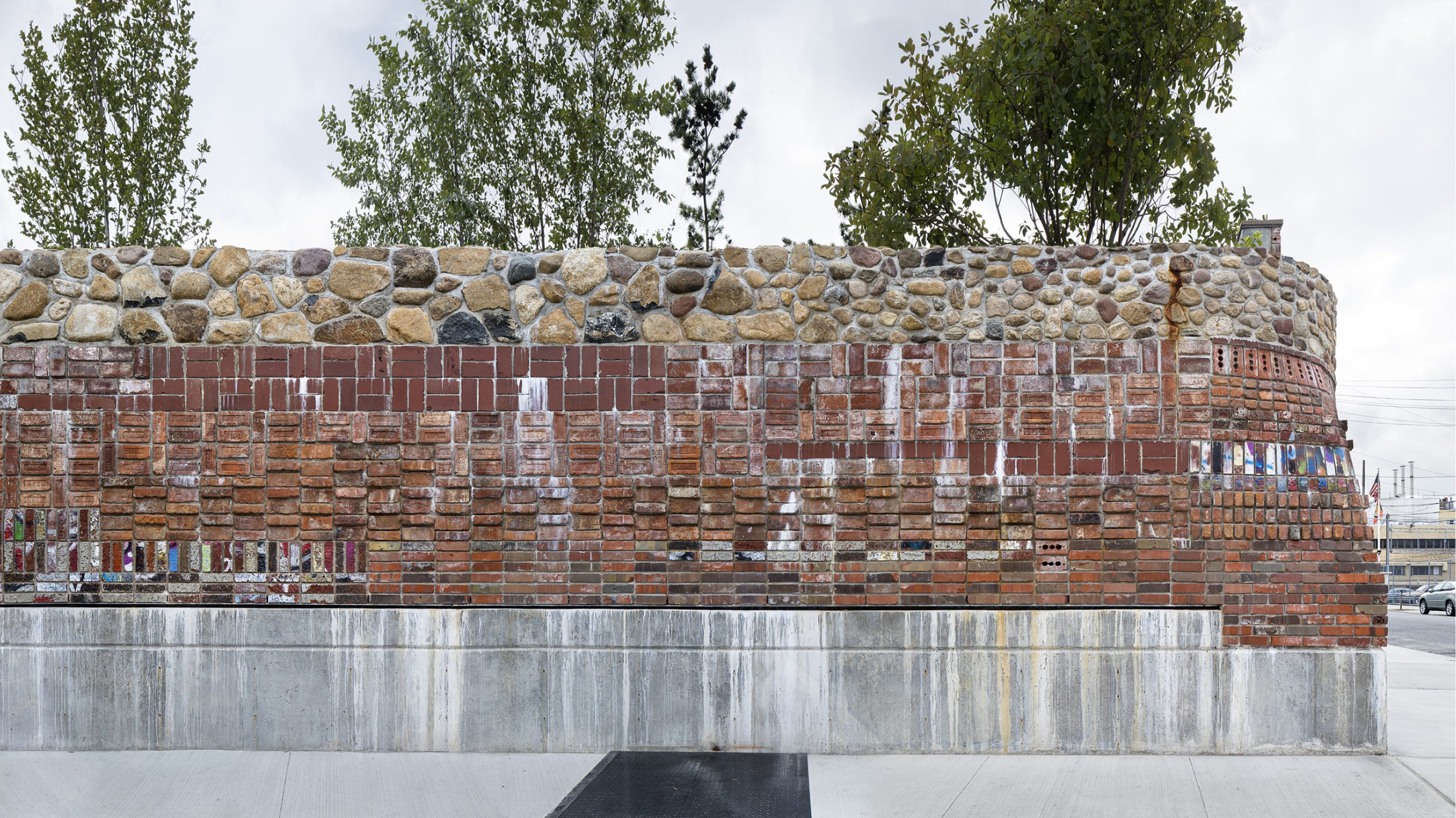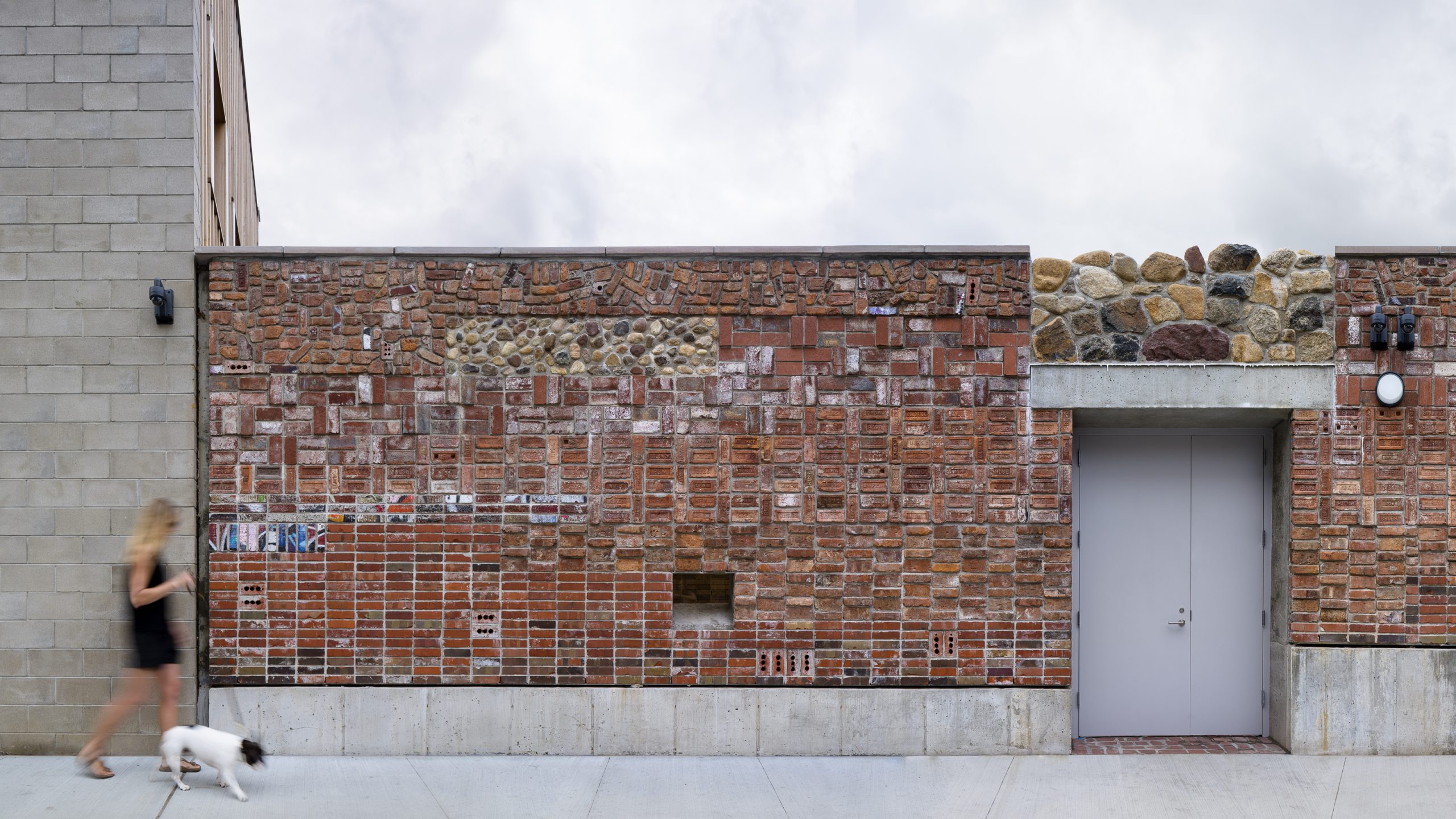 This wall is an artwork constructed of pieces from previous buildings on this site-from 16,000 years ago to today. We reused over 11,000 salvaged bricks from the demolition of an existing warehouse to create a 200-foot long street wall of reassembled bricks and stones.