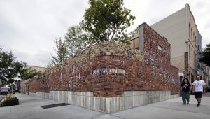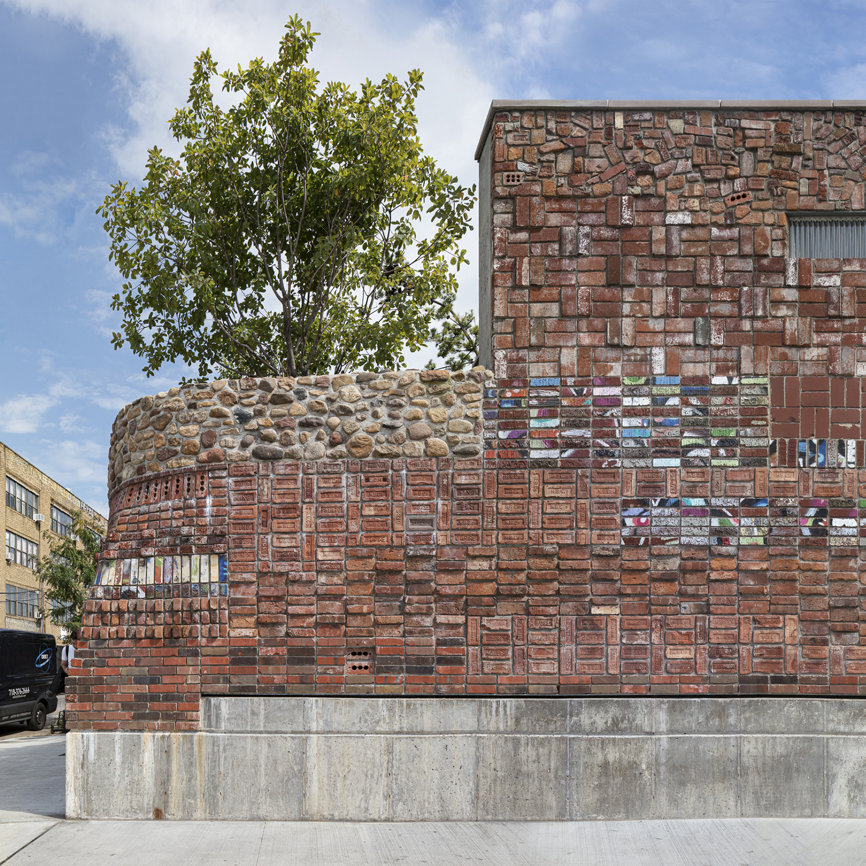 Our team designed the wall and oversaw construction in collaboration with a group of master masons. The bricks were cleaned and scraped by hand on-site, counted and sorted by type (graffitied, stamped, face brick, back brick, ribbed, terracotta block, extruded, molded, Gneiss from Manhattan bedrock, bluestone from Pennsylvania’s quarries, and tumbled sandstone glacial till). The bricks were arranged into seven types of bond patterns and placed on a new concrete wall as a masonry veneer, illustrating history in an impressionistic tapestry.