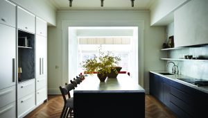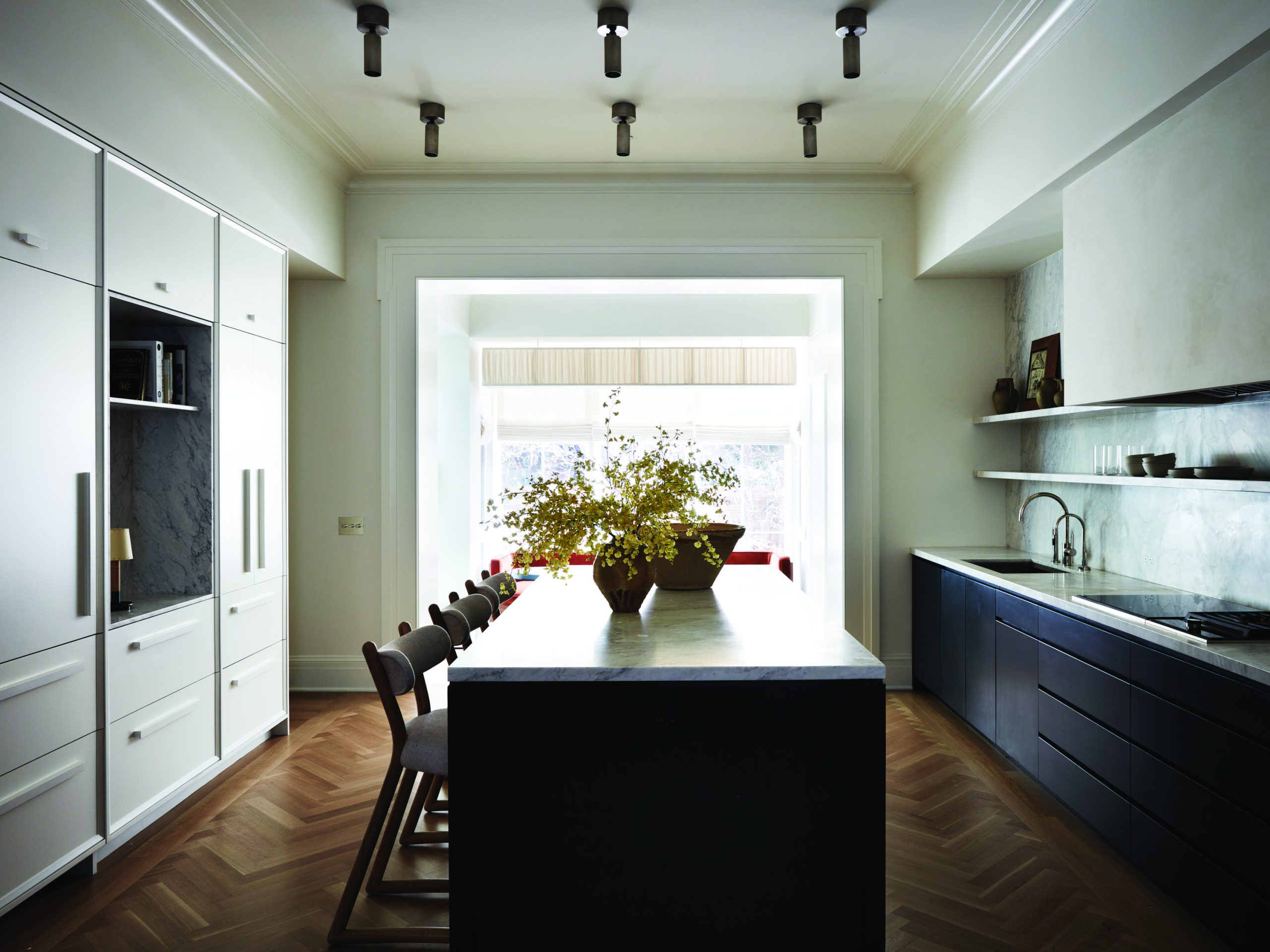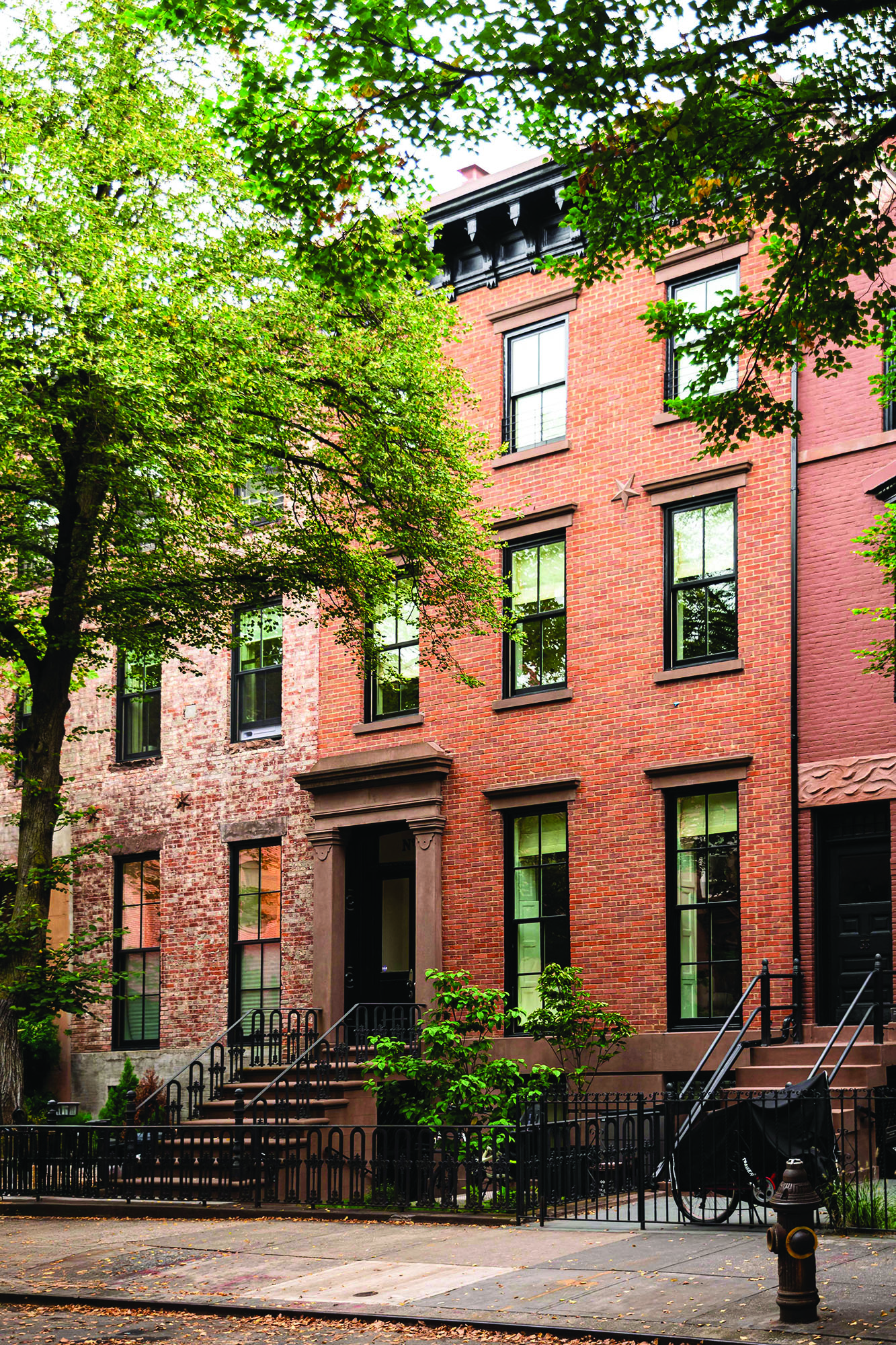 From the front facade through to the rear extension, the building morphs from a historic Greek revival townhouse into a modern and individualized family home. The transition can be seen in the paired down millwork details of the kitchen, a space that has long been the bridge between public and private life. The rear extension connects the home to the backyard through a two-story bay window, framing a mature juneberry tree.