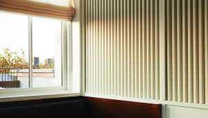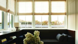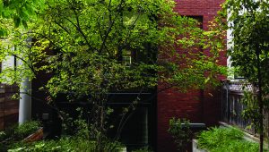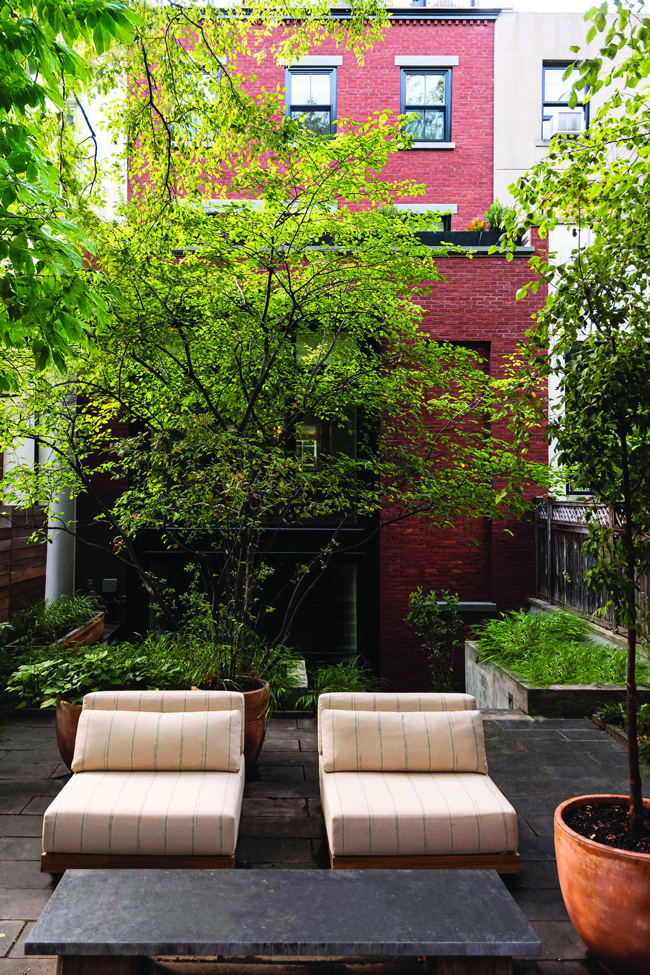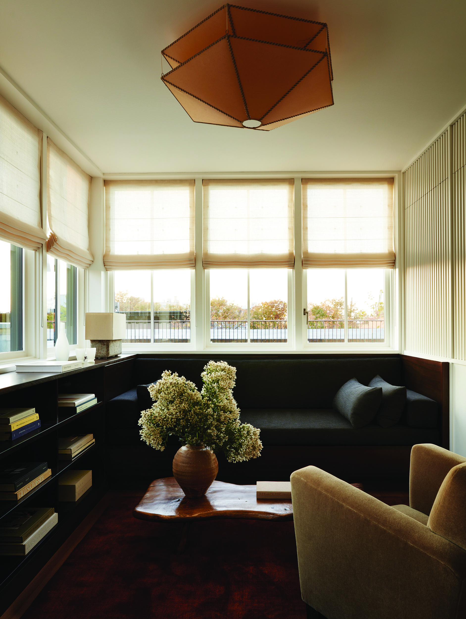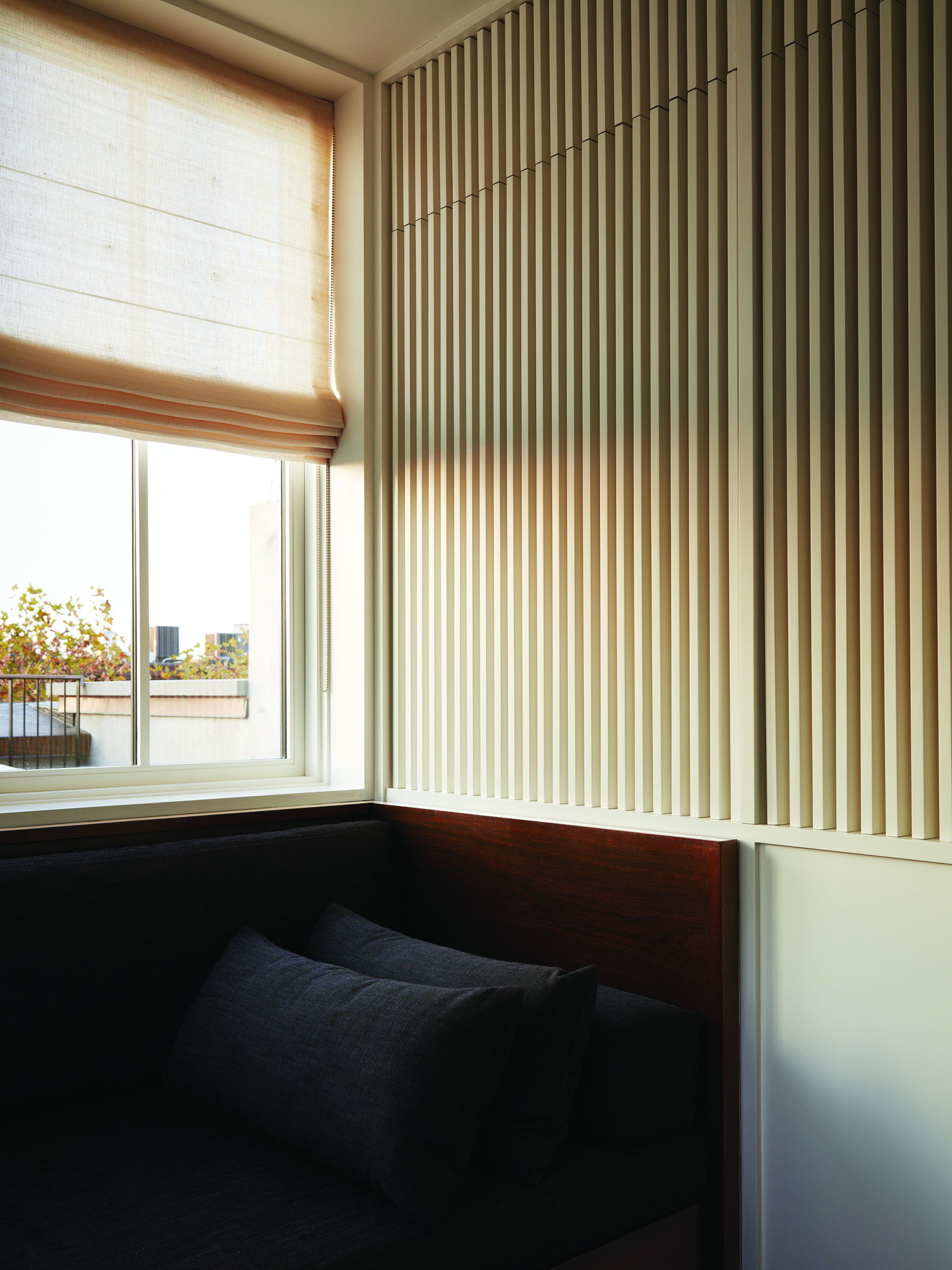 The home is capped by a reading room wrapped in mahogany millwork, including integrated bookshelves, daybed, and wet-bar. This penthouse was thoughtfully designed to be concealed from the streetscape below, maintaining the historic Cobble Hill rooflines.