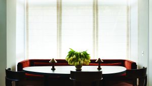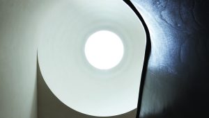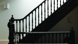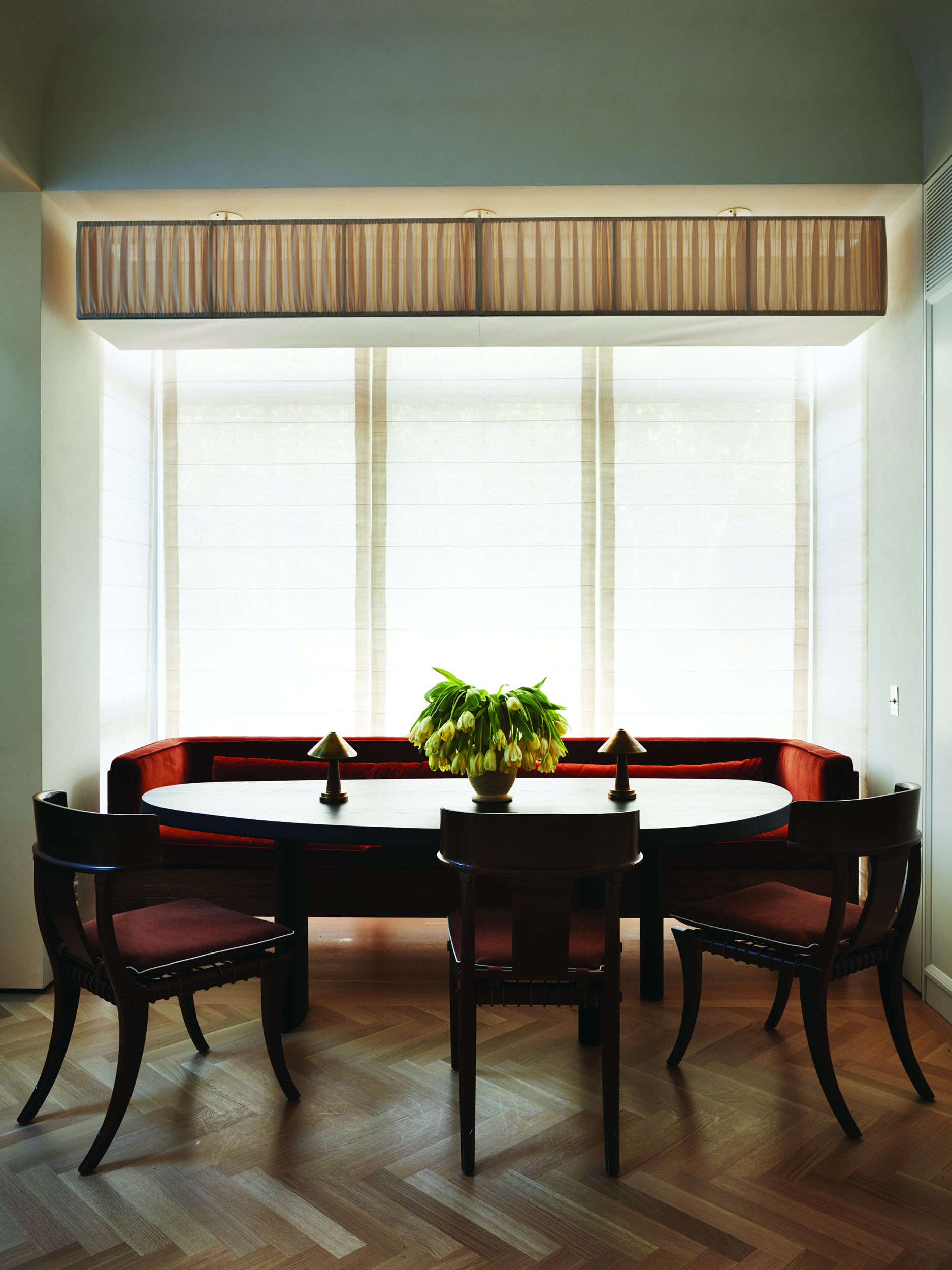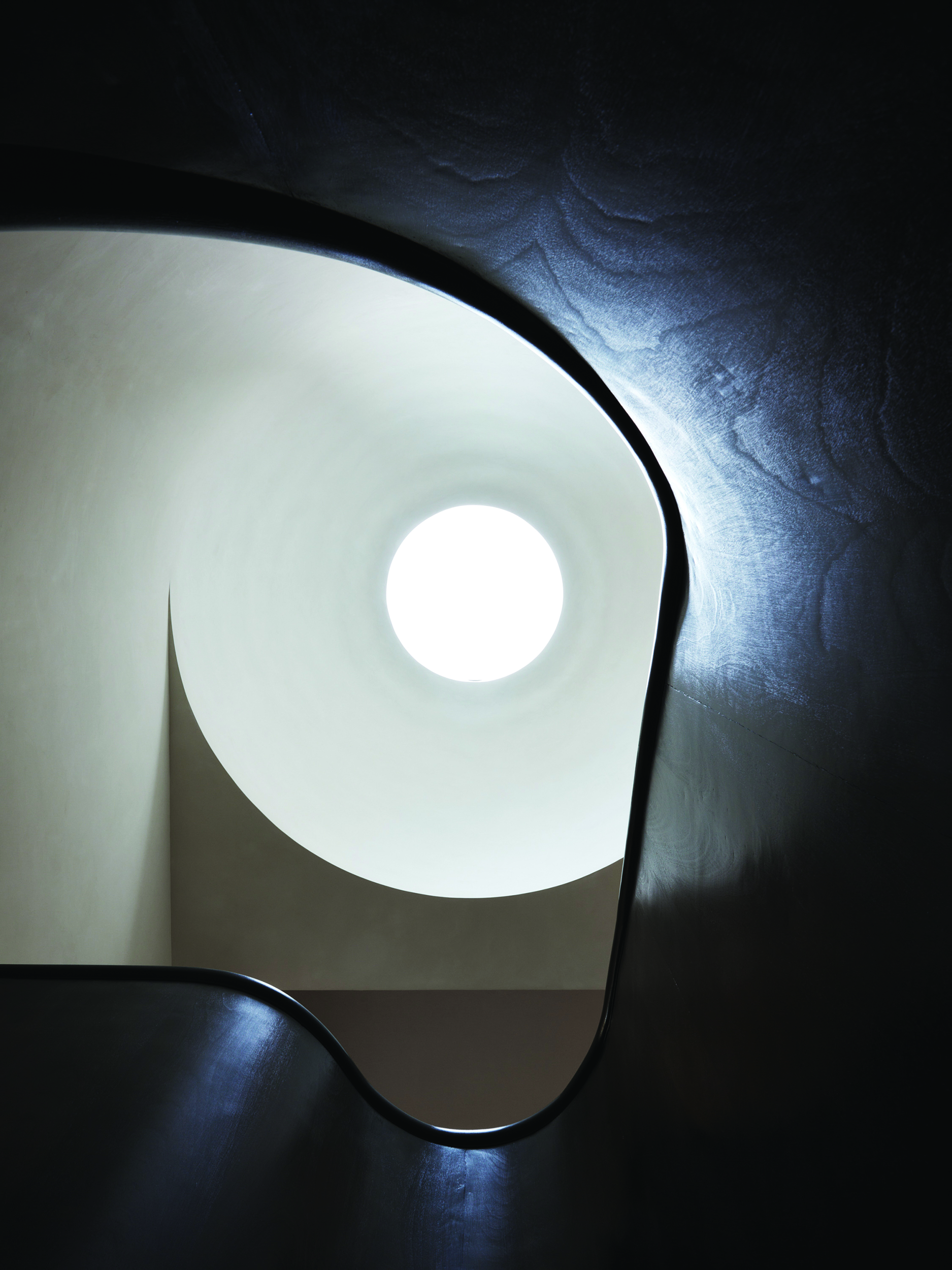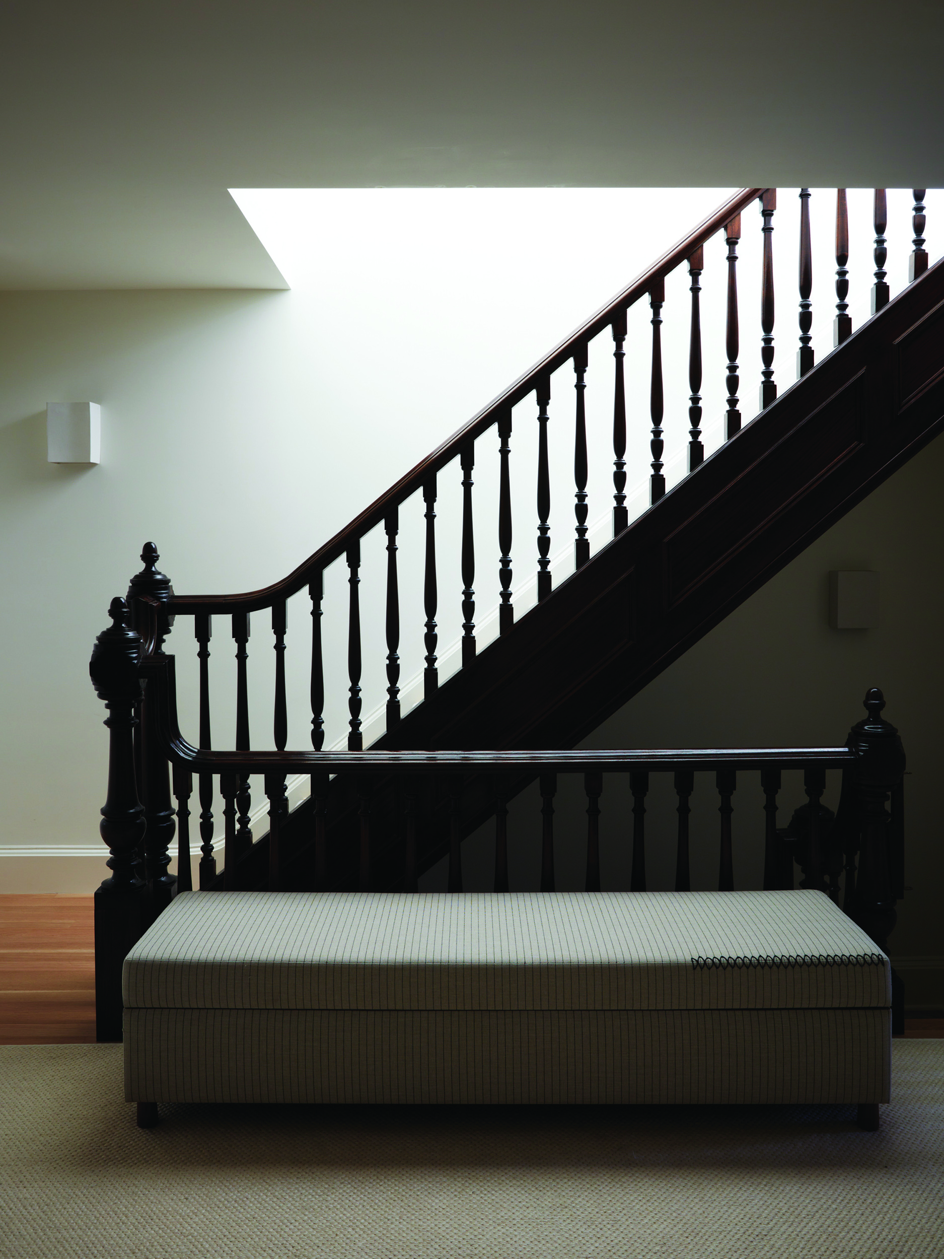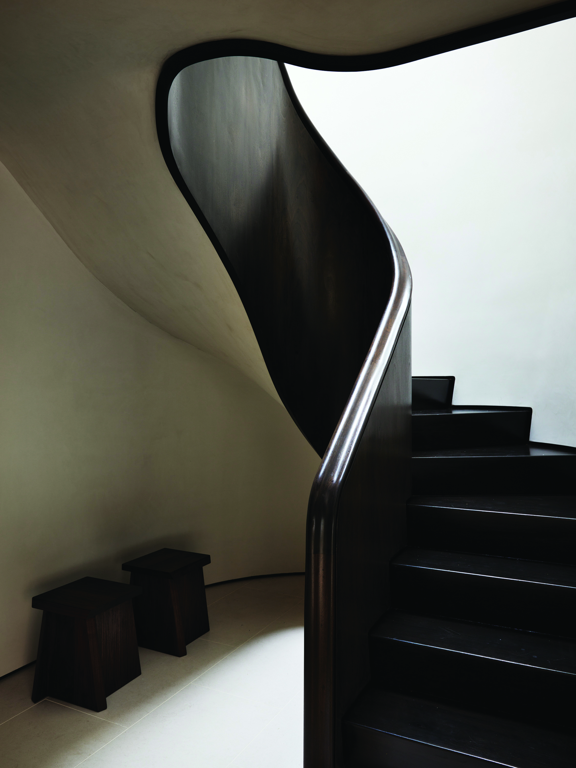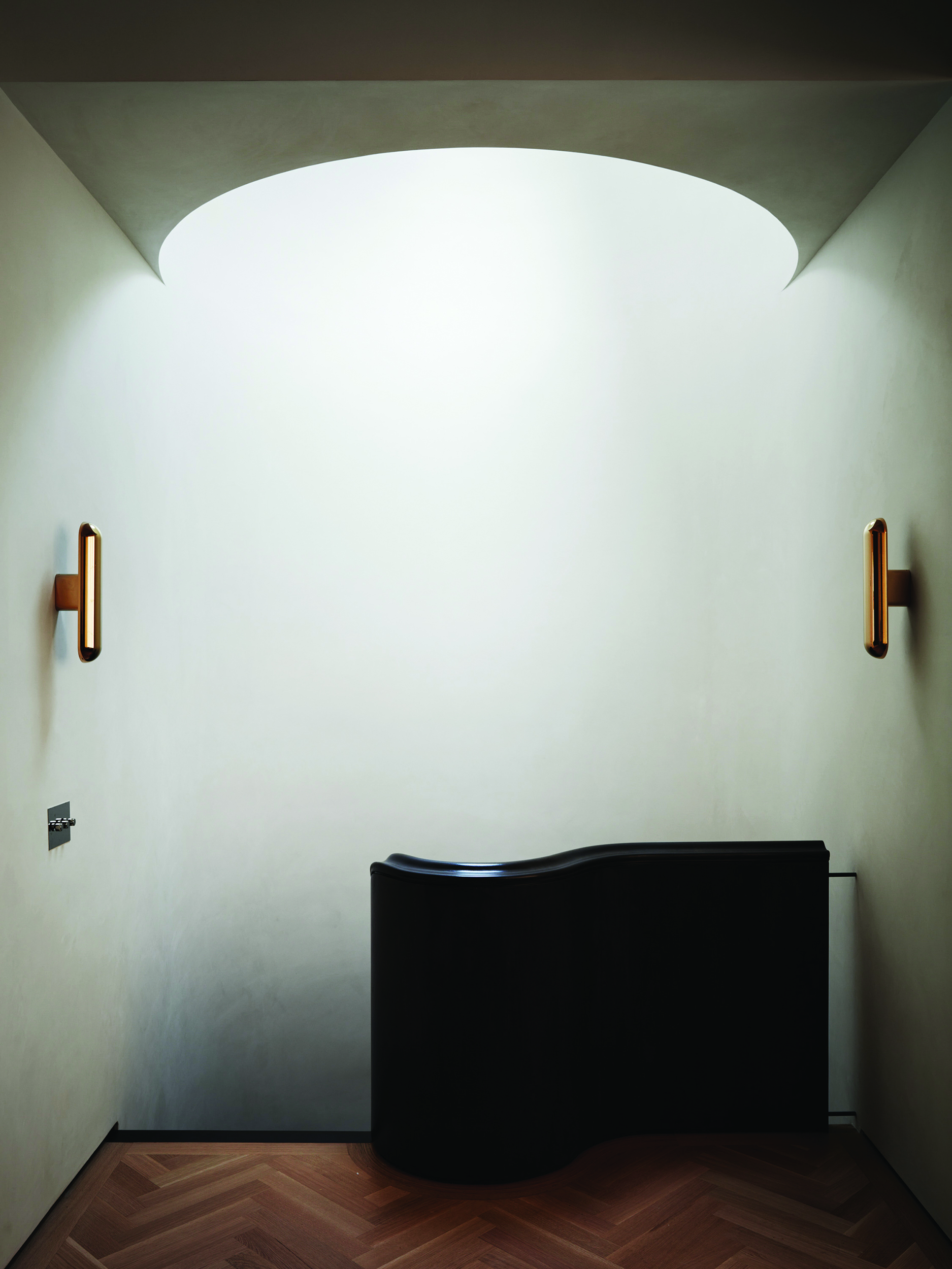 Within the rear extension, the owners’ love of Ancient Rome and artist James Turrell is married in an ethereal dome punctuated by a circular skylight. A sculptural mahogany stair connects the garden and parlor floors and draws parallels to the existing Queen Anne staircase.