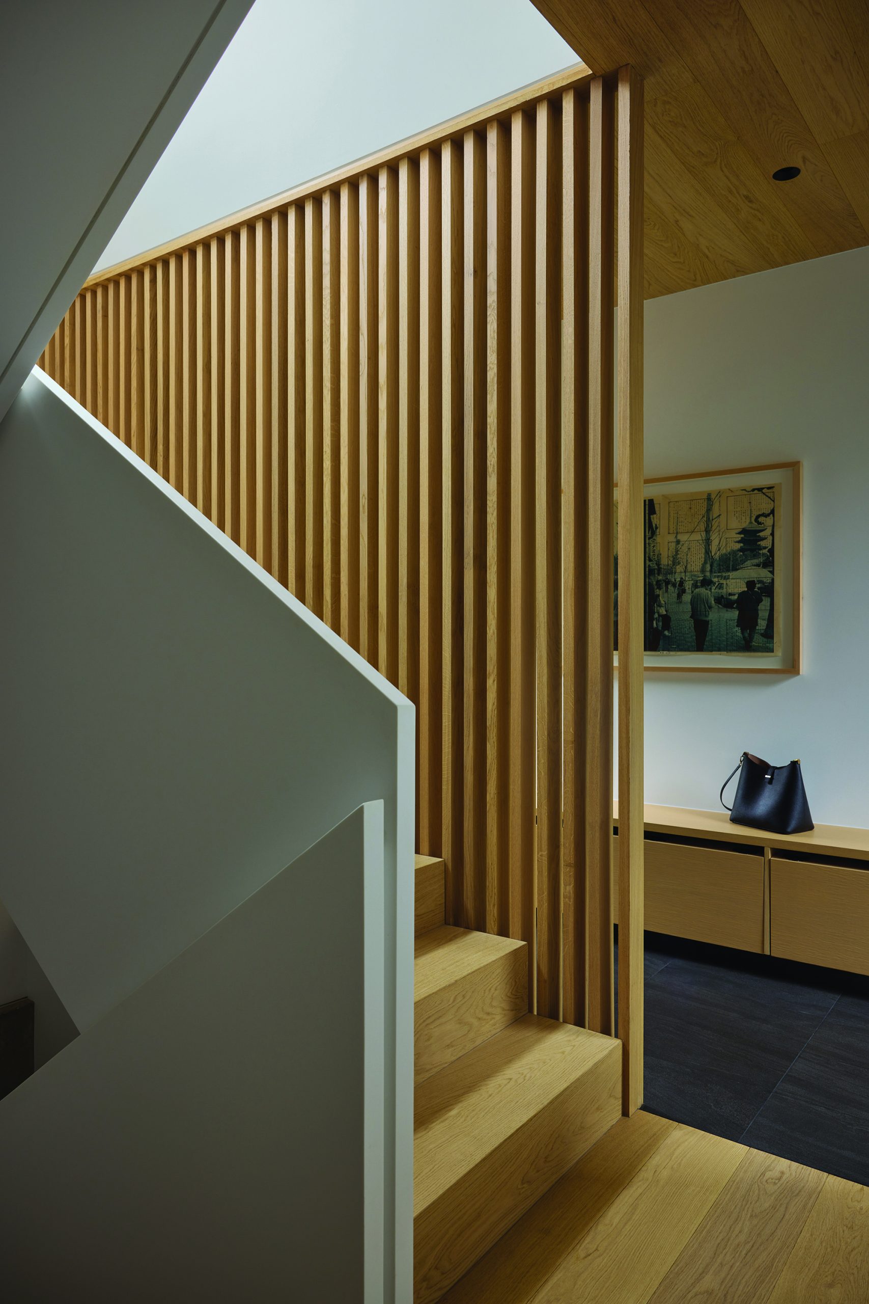 The client’s and architects’ commitment to green building shaped many design decisions. The House in the Lanes is a ‘positive energy’ home, meaning it produces more energy than it consumes. A rooftop solar array, ground source heat pump heating and cooling, and an energy recovery ventilation system ensure the house meets its energy needs while minimizing its environmental footprint. The exterior wrapper was developed with a building envelope consultant to minimize thermal bridging and provide air- and water-tightness.   The home includes an electric car charger, further reflecting the client’s future-focused mindset.