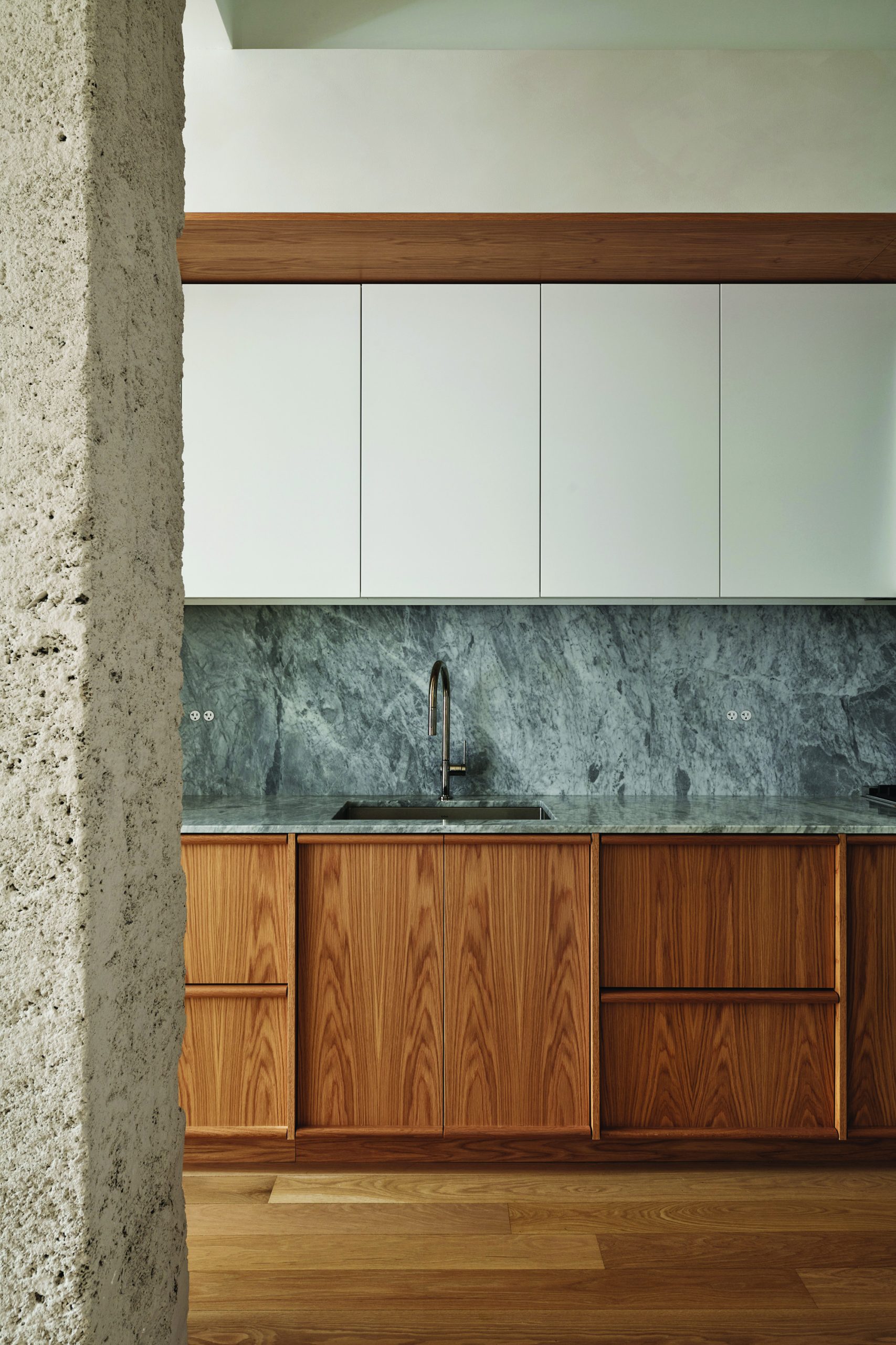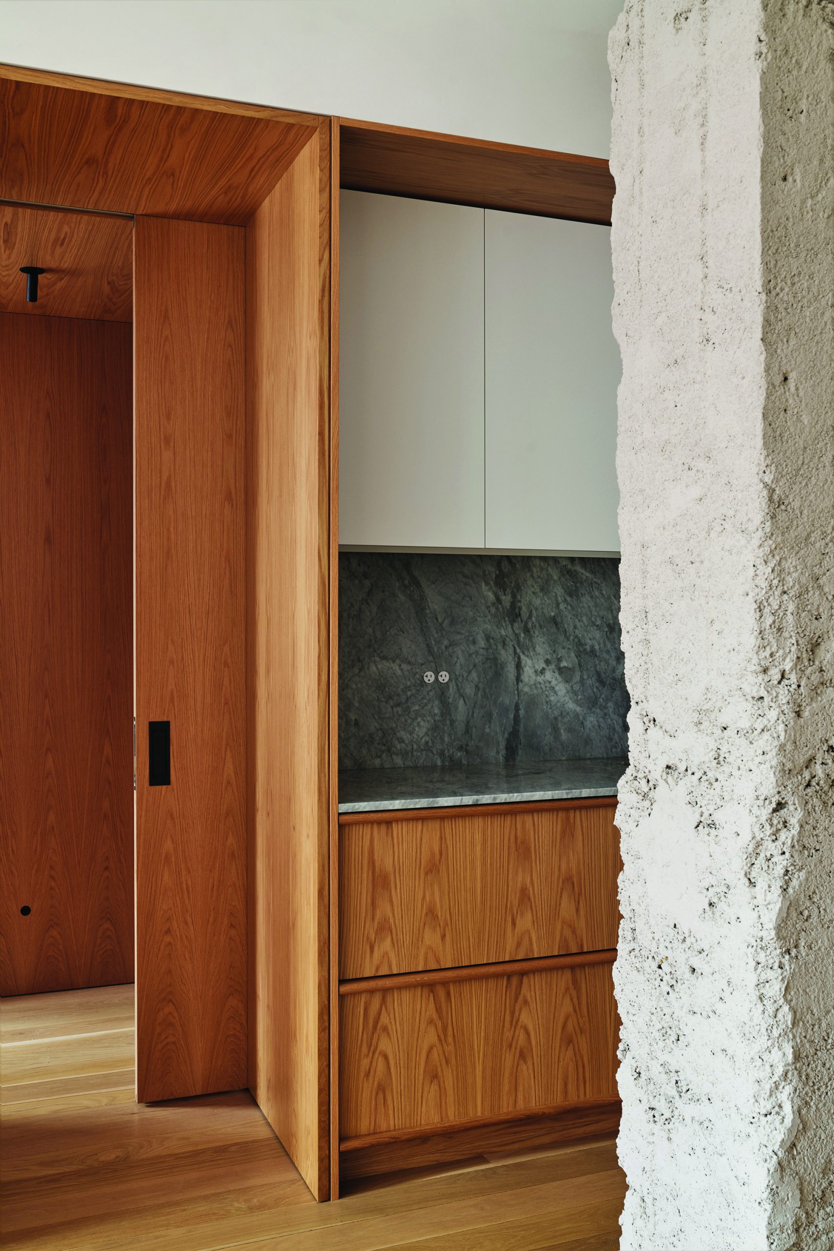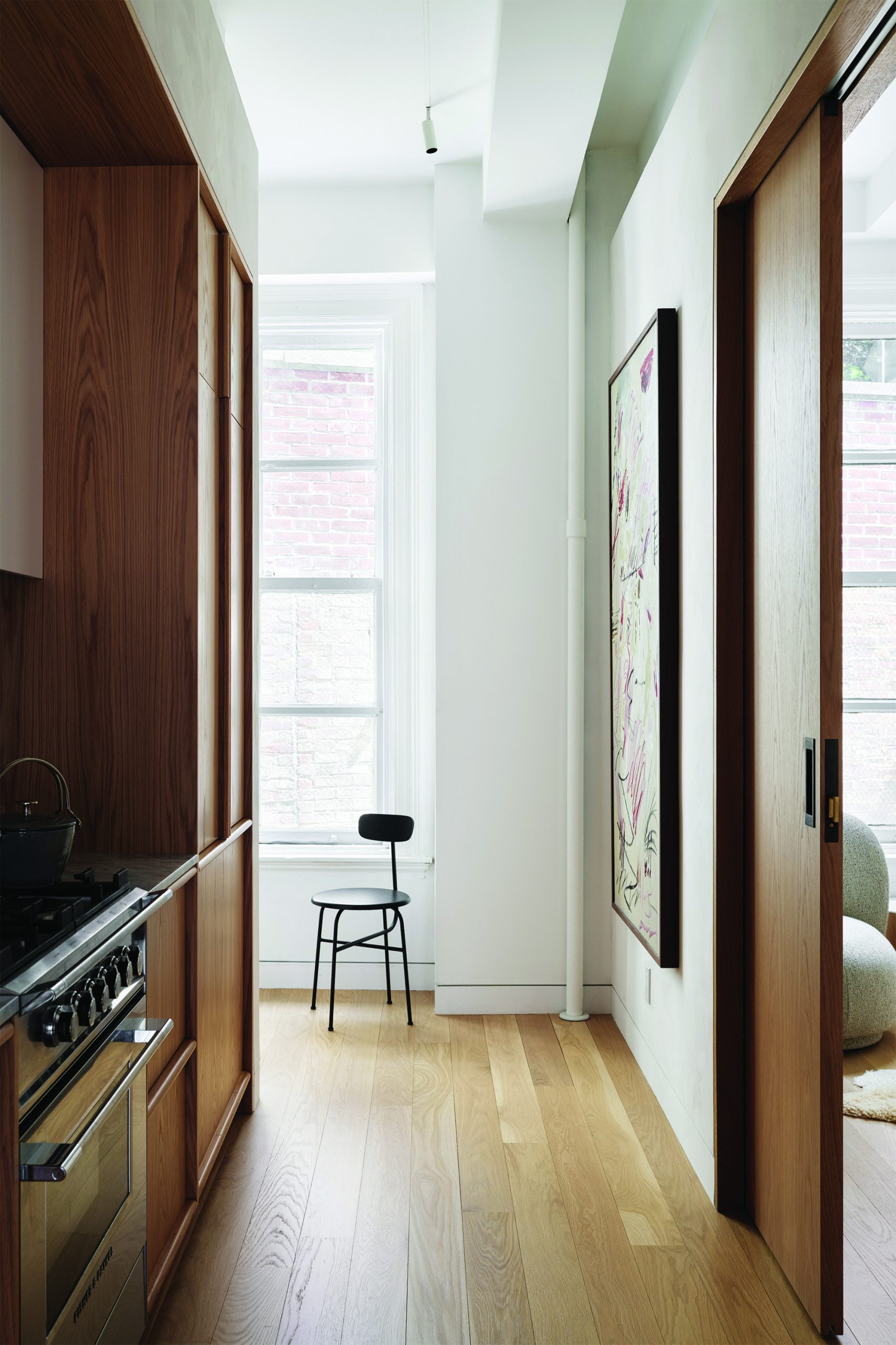 Two compact children’s bedrooms were arranged in a “railroad style”, the smaller of the two was designed with a oversized pocket door that can open fully to the kitchen. A wood-lined vestibule forms the threshold to the primary suite, where a pocket door allows the bathroom to serve a dual role—functioning as a private en-suite when closed, or as an accessible bath for the main living spaces when open. Throughout the apartment, textures and materials were chosen to heighten the sense of richness and tactility. In the kitchen, the original, rough fireproofing was exposed.