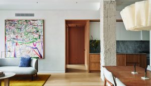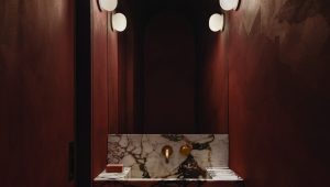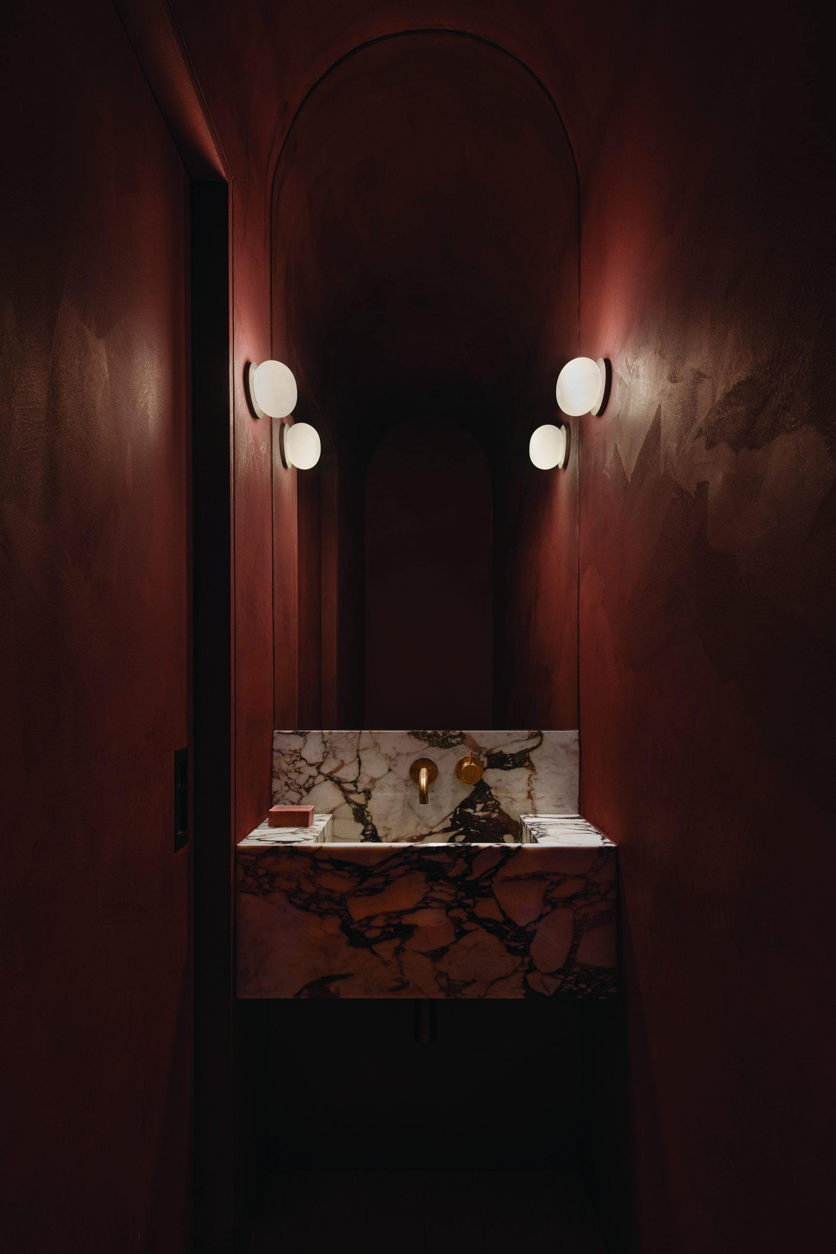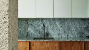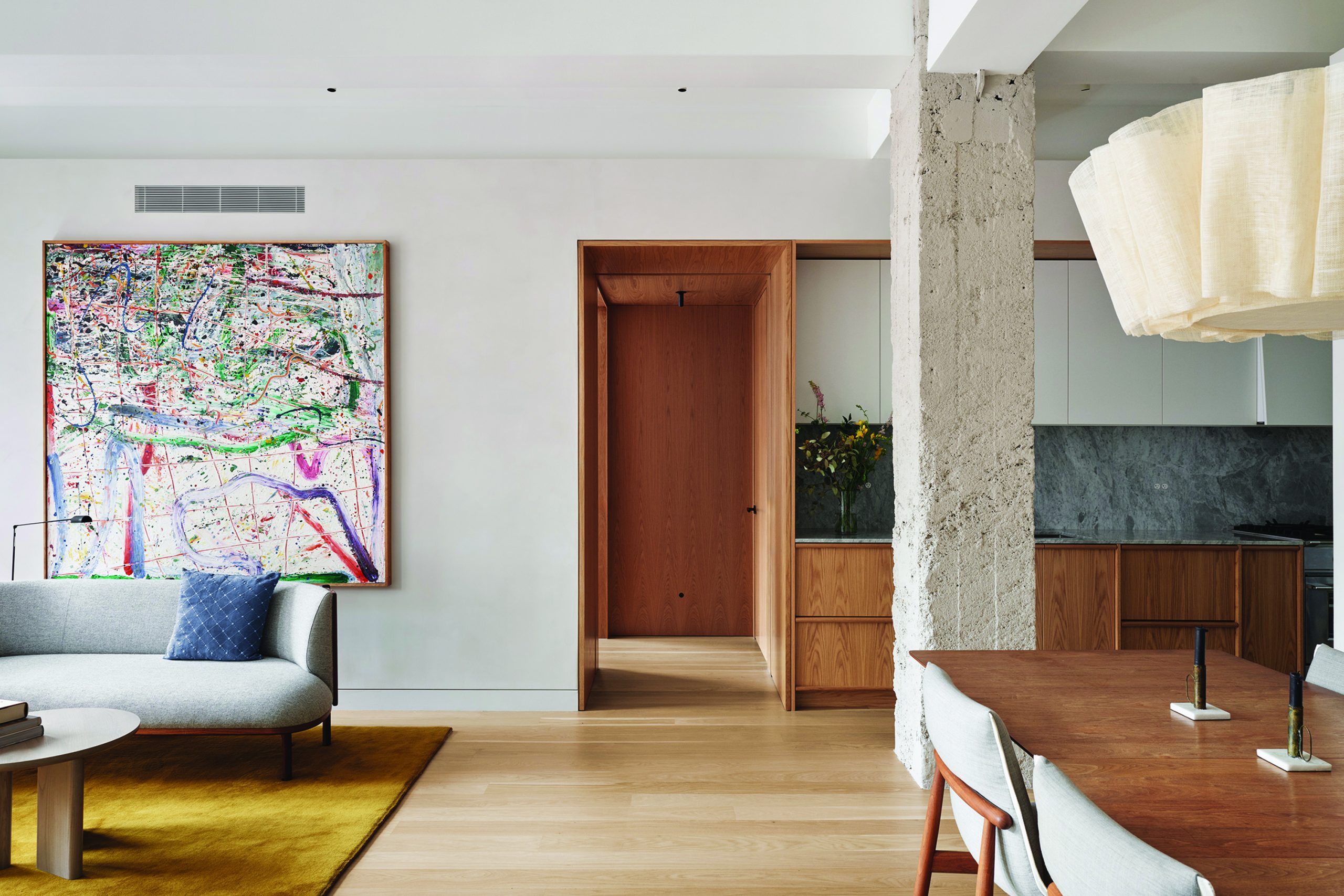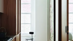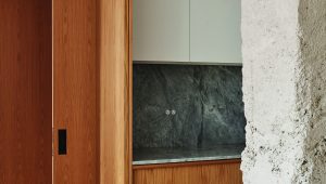 Two compact children’s bedrooms were arranged in a “railroad style”, the smaller of the two was designed with a oversized pocket door that can open fully to the kitchen. A wood-lined vestibule forms the threshold to the primary suite, where a pocket door allows the bathroom to serve a dual role—functioning as a private en-suite when closed, or as an accessible bath for the main living spaces when open. Throughout the apartment, textures and materials were chosen to heighten the sense of richness and tactility. In the kitchen, the original, rough fireproofing was exposed.